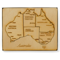 Australian designed and made wooden puzzle by Sydney based artisans - Wooden Crafts. Puzzle features each of the Australian states, along with key cities and towns. Available in two sizes - Small and Large.