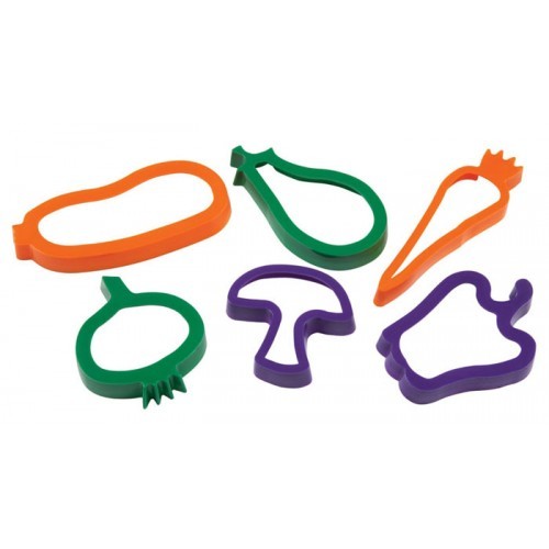 - 6 coloured plastic cookie cutters - onion, eggplant, capsicum, carrot, mushroom, and zucchini