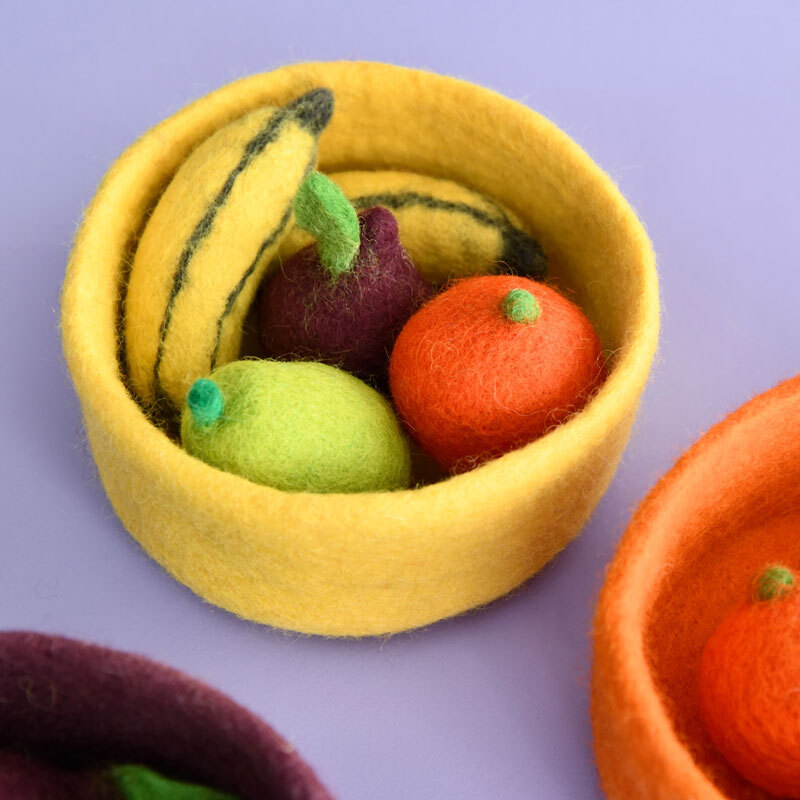A beautiful assortment of five pieces of felt fruit with a matching sorting bowl. Unique and handmade beautiful pieces to encourage learning and inspire imaginative play. Each set comes with randomly selected fruit pieces and a coloured bowl. The natural and tactile felt fruit is designed for little hands to easily grasp. Felt bowls are just the right size for sorting and storing their toys and most prized possessions. Felt pieces encourage little ones to engage in role-playing with their very own store or farmer's markets while learning to interact with friends, cooperate, and share.