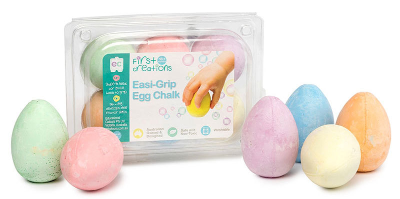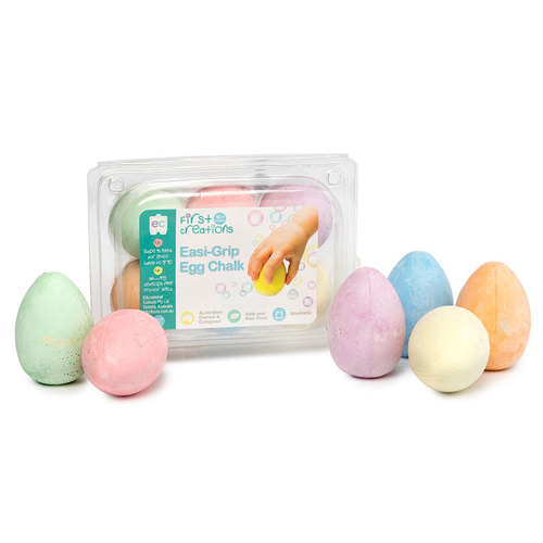 First creations Easi-Grip Egg Chalk was designed especially to fit in the palm of a child's hand. Egg-shaped to allow for full hand grip use on blackboards or the pavement, brick walls and concrete surfaces! Chalk can be removed from large areas by washing down with water.