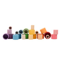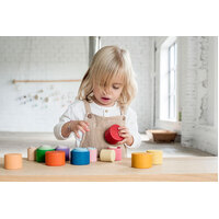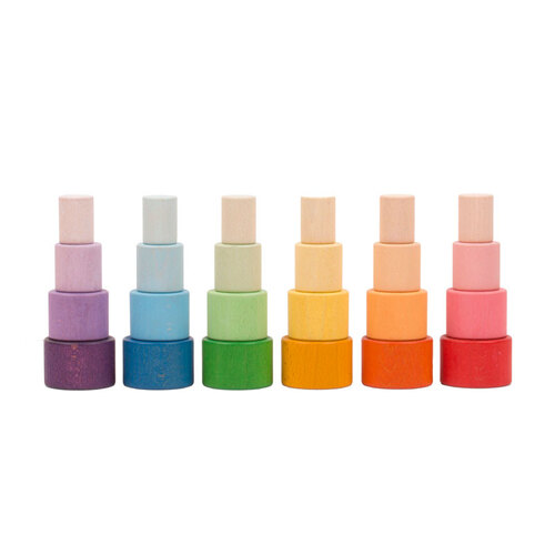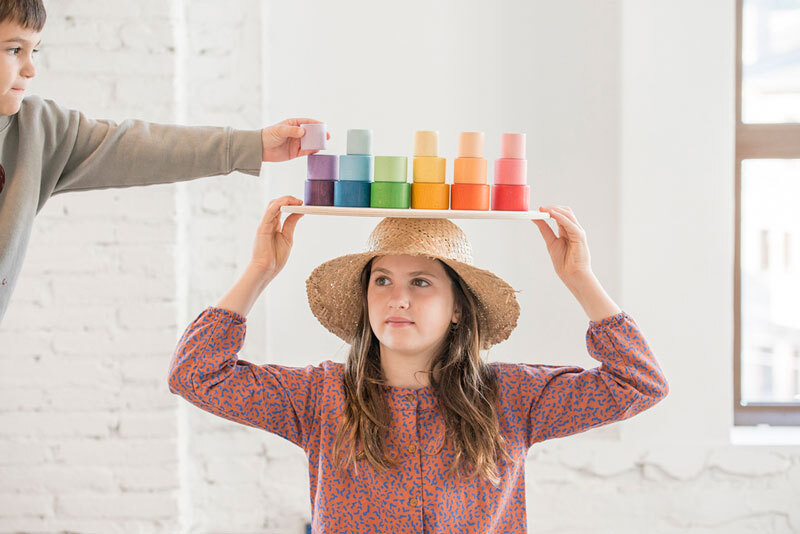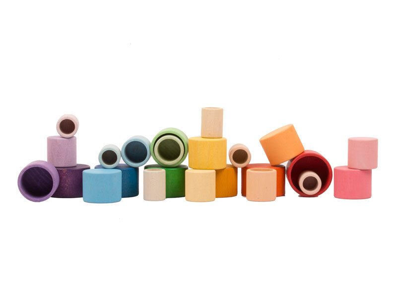 The Grapat Nest Bowls come in 4 different sizes and in 6 gradient colours. Each of the 6 colours includes 4 bowls in a gradient of its hue from brighter to lighter shade. The bowls can be complemented with stringing, stacking, hiding and discovering different games. The four different sizes also allow grouping and associations with size and shape to help develop logical, mathematical thinking skills.