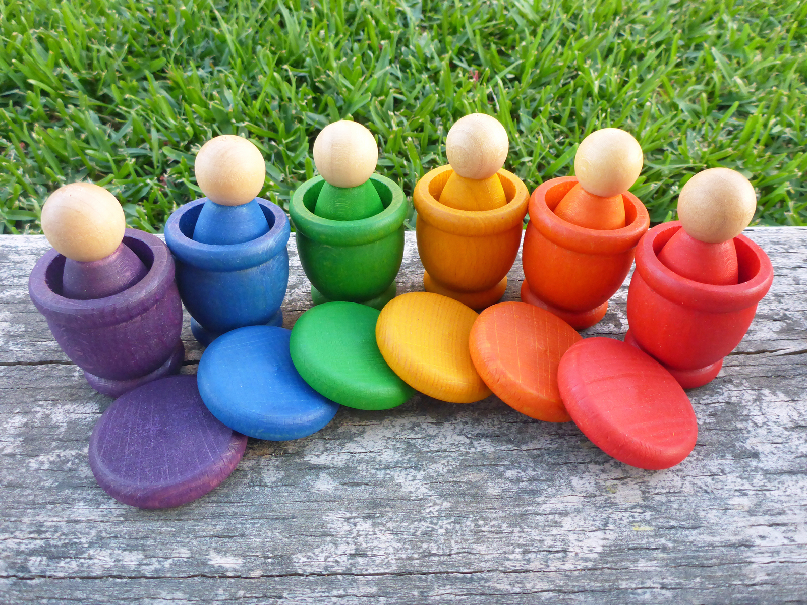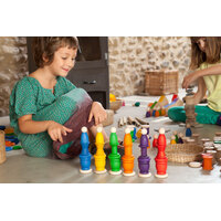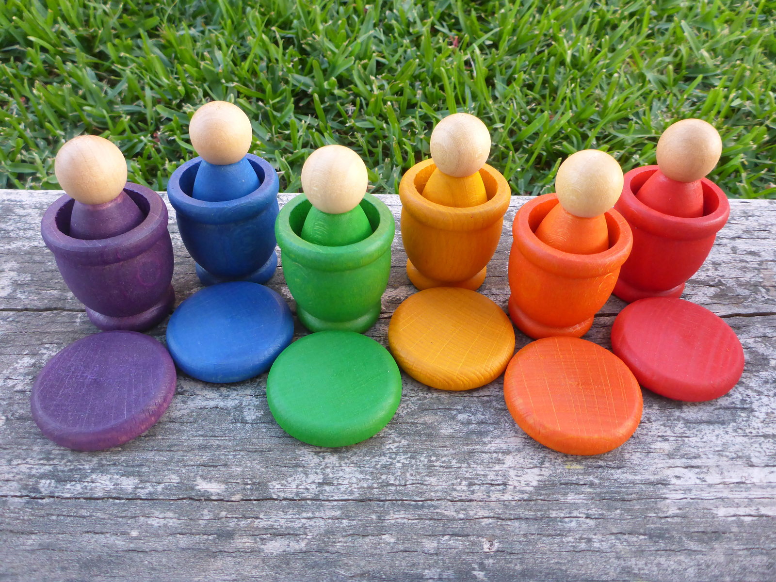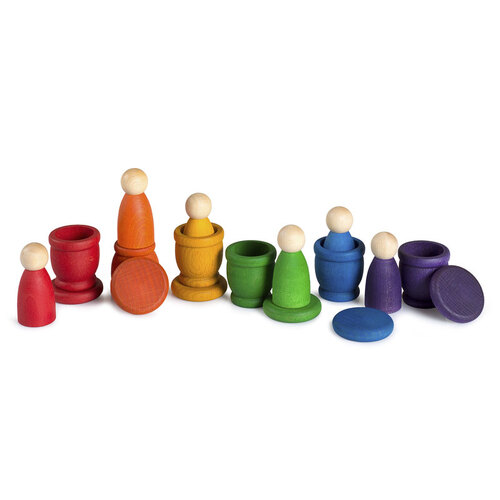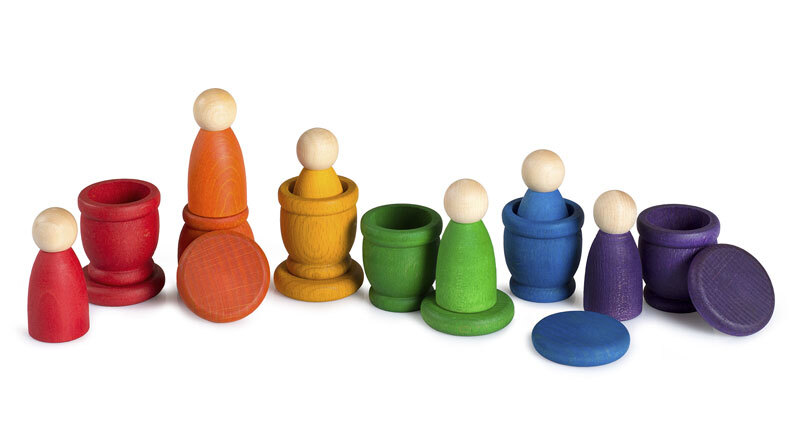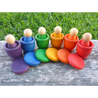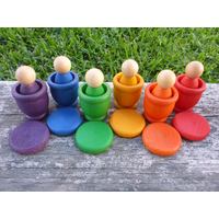 The Grapat Nins and Mates set comes with their own cups and circular lids/coins or discs. Pile them up, take them out, put them in, cover or uncover. Endless play opportunities with this set.