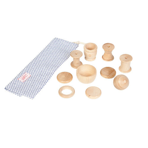 Grapat Natural Treasure Basket Contains 10 different shaped wooden pieces which are designed to be a collection of open-ended treasures. The basket provides elements to inspire creative exploration and to improve logical-mathematical thinking, based on sensorial and discovery games which are the first games that children play.