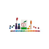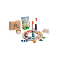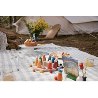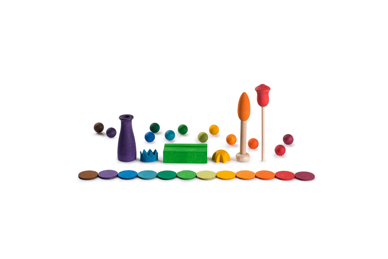 - Contains 31 pieces in different shapes, sizes, colours, and materials (wood and felt).