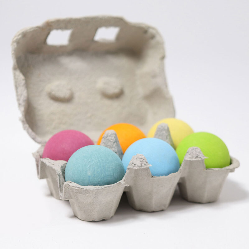 Grimm's 6 Wooden Balls Pastel are perfectly round and all individual hand-painted in new pastel colours. Perfect for playing in combination with Grimm's rainbows, bowls or boxes.