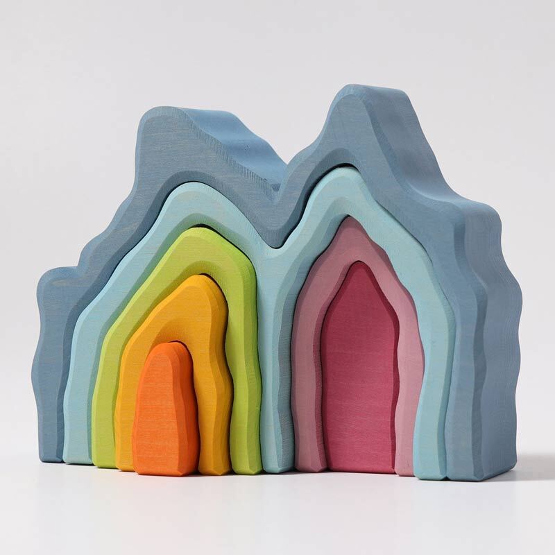 The beautiful Grimm's Blue Cave Arch Stacker has seven large stacking pieces (5.7cm thick) that are more like waves or organic forms than traditional geometric blocks. Each piece has a distinctive shape and can be used for building dwellings or caves and can turn a standard set of blocks into something magical. The Coral reef stacker also makes a fabulous statement as a decorative piece.