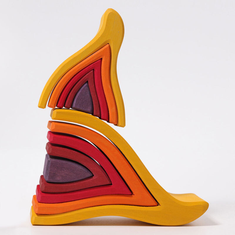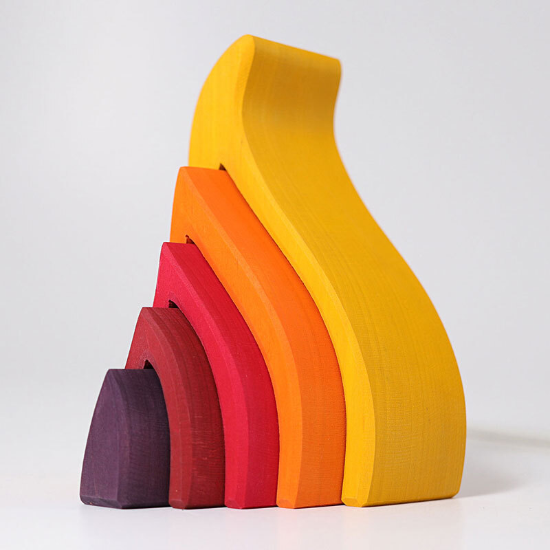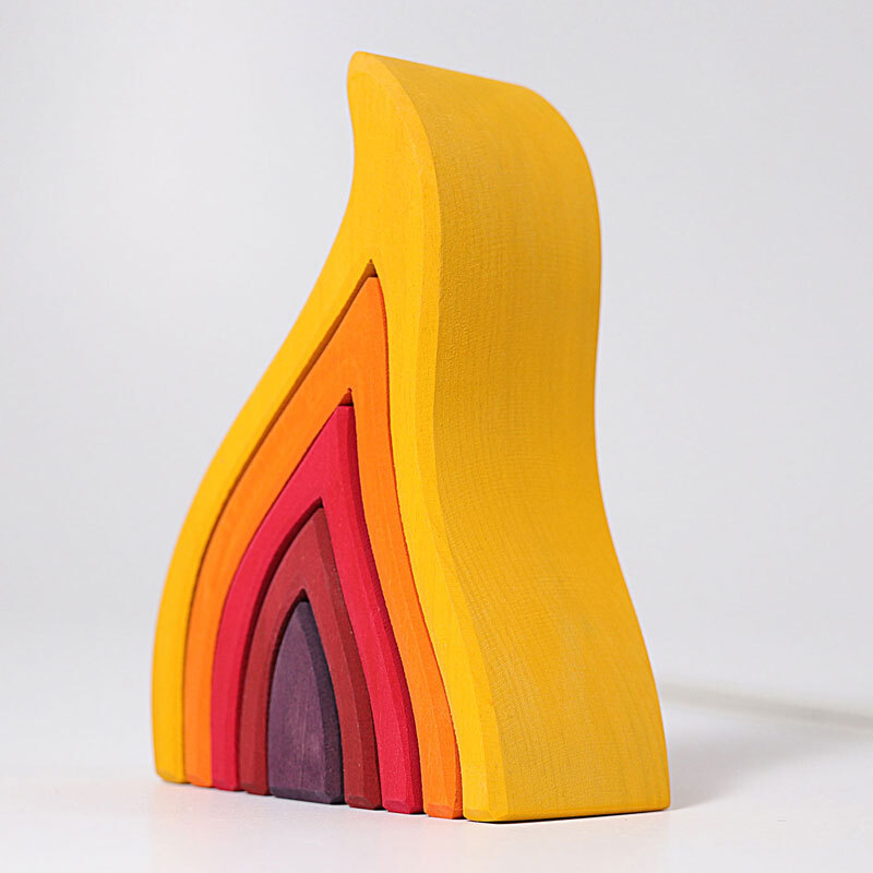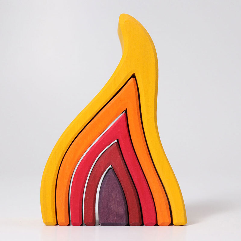 Toddlers will love creating their own sculptures with the Large Fire from Grimms. Use the pieces to stack, sorting and recognise colour and spatial size variations. The fire also makes a very attractive piece for a child's room! Grimm's Fire is handmade from sustainably managed lime wood forests in Europe. The picture shows the relative size of the small and large fires.