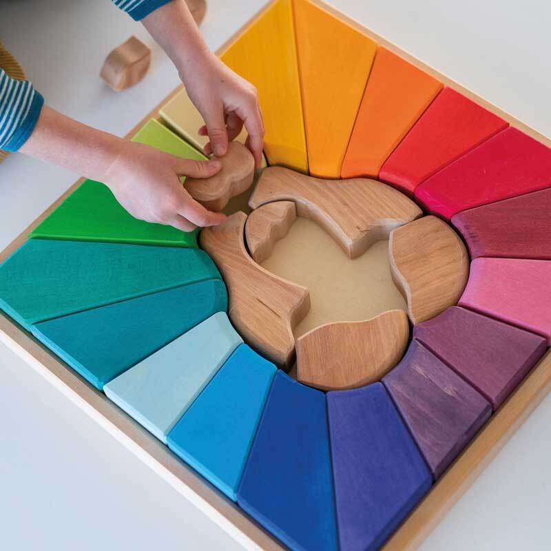 A wonderful building set in a wooden frame that combines organic shapes in oiled natural wood and colourful geometric shapes. The Majestic Lion Building Set is much more than a tribute to the beautiful lion.