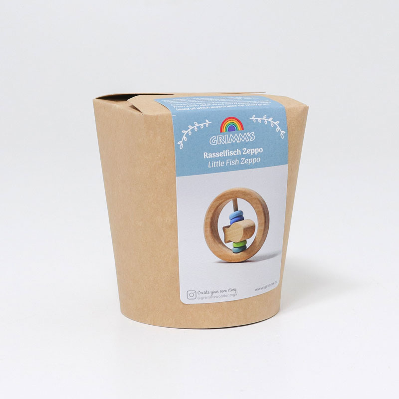 Rattle Little Fish, with wooden coloured discs in green and blue. The wood used from the alder tree is very special and gives unique structure to each of our rattles and grasping toys. The plant-based oil finish protects the wood and accentuates this vivid structure.