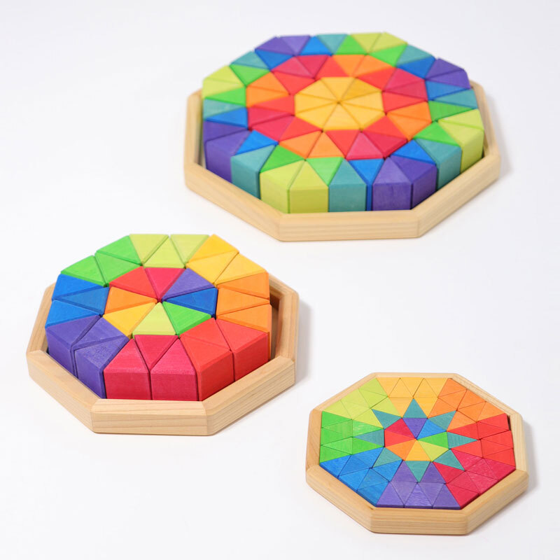 Grimms Octagon puzzle is made up of 72 multi-coloured triangular pieces. Create your own unique patterns with the mosaic or use the triangular blocks pieces for building.