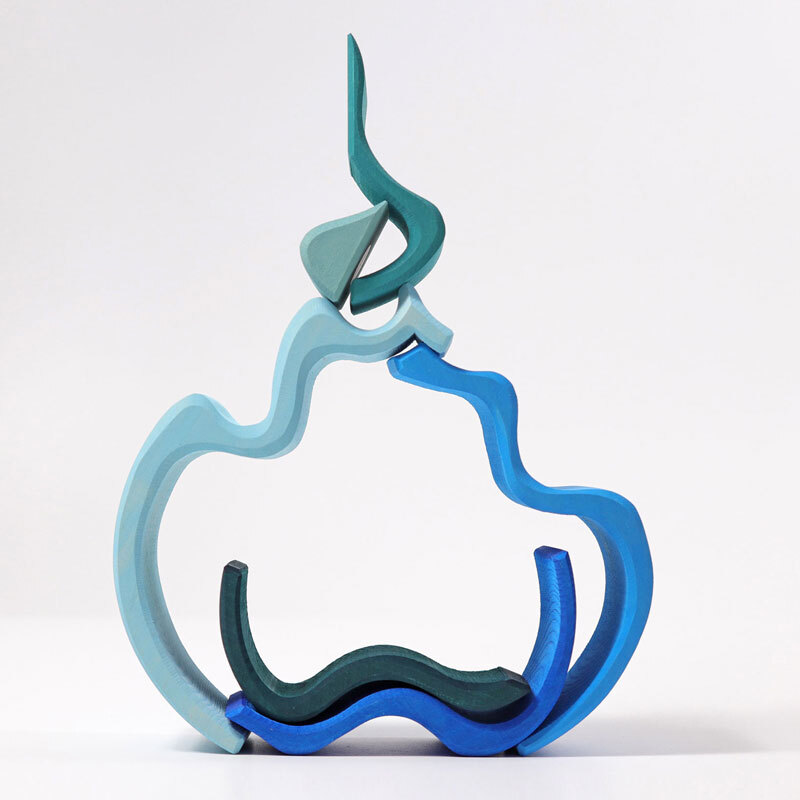 Grimm's Water Waves is a wooden stacking puzzle representing the element of water. Use the pieces for stacking, sorting and recognition of colour and spatial size variations. Children can also integrate the pieces with animals, figurines, and miniature dolls for added creative play value. They also make a very attractive piece for a child's room! The second picture illustrates the relative size of large and small water waves.