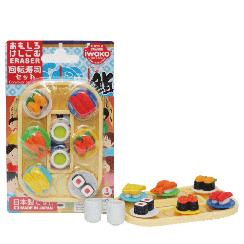 - The sushi train set of erasers are sold as a blister pack