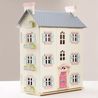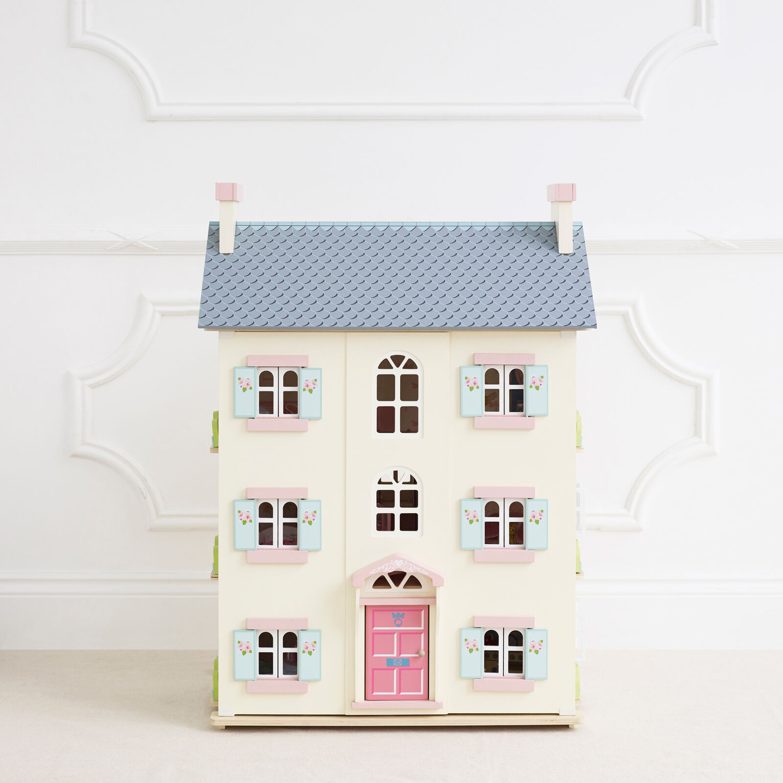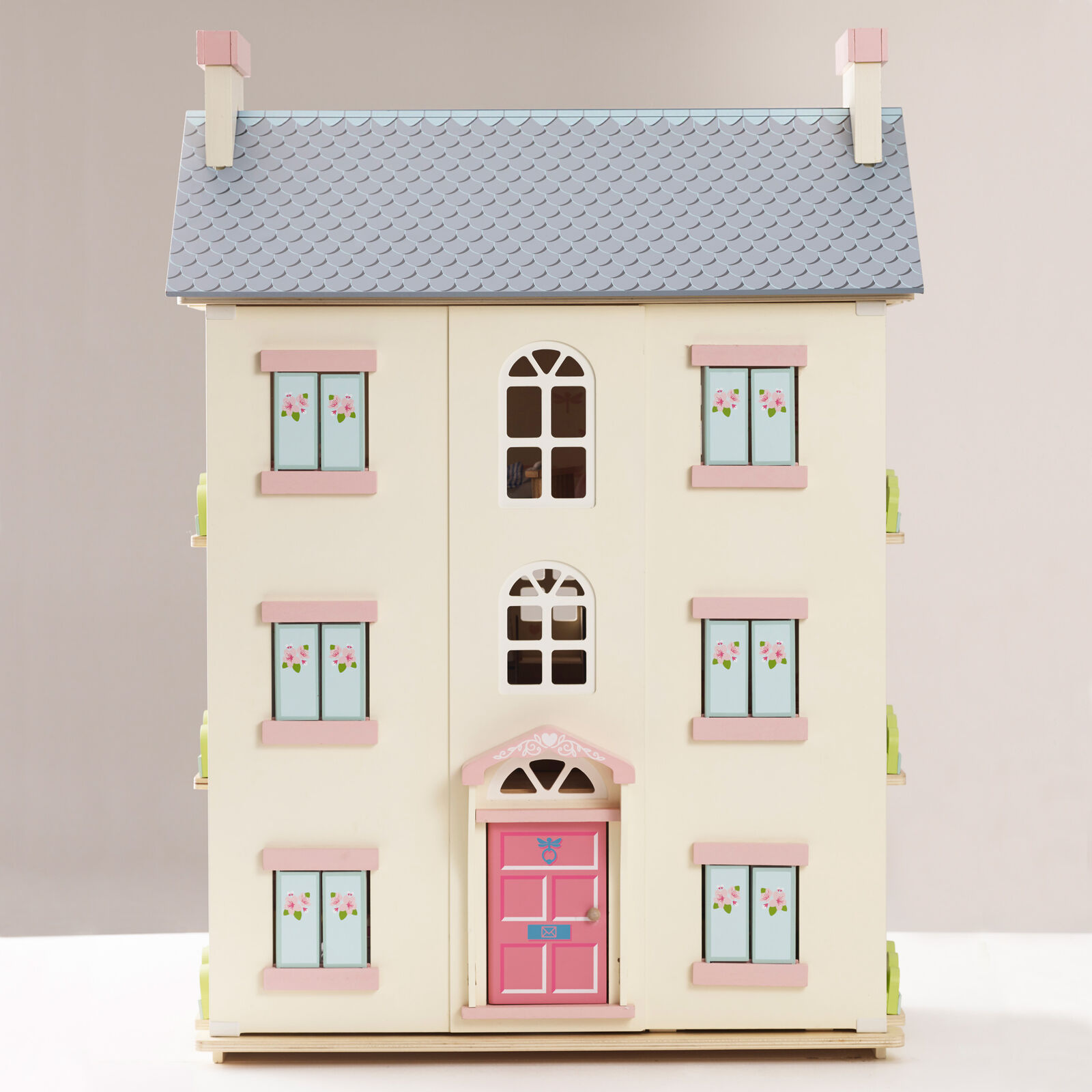 Standing at 92cm high with 4 stories this doll's house features a beautiful arched window and fresh floral design. Pretty windows and shutters are on both front and back, so little ones can let the natural light shine through. Open the front to reveal a world of immersive play. Each room is individually decorated with a wooden staircase and decorative banister. The grey tiled roof with its impressive chimney stacks lifts open to the attic space, accessed by a cute loft ladder. A true dream home for any little one to love and makes a special gift to be treasured and passed on through the years.
