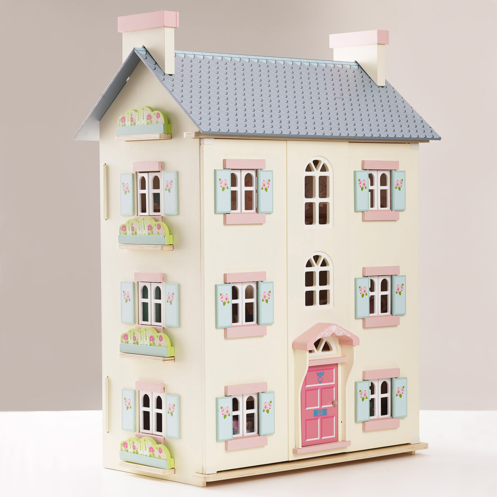 A grand four-storey dollhouse with a floral motif. Each room is decorated differently to define room space. It features numerous window styles including functioning shutters and back windows to allow light to shine through.