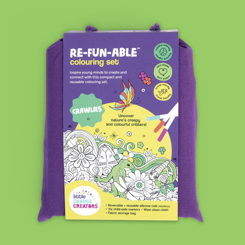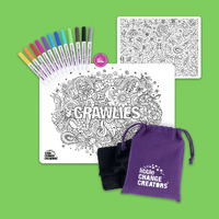 Uncover nature's creepy and colourful critters! Inspire young minds to create and connect anywhere they go with this compact and reusable colouring set. Ideal for travel, this reversible colour-in mat features two erasable surfaces for double the fun! There’s also ample space for young artists to doodle, draw and write…again and again.
