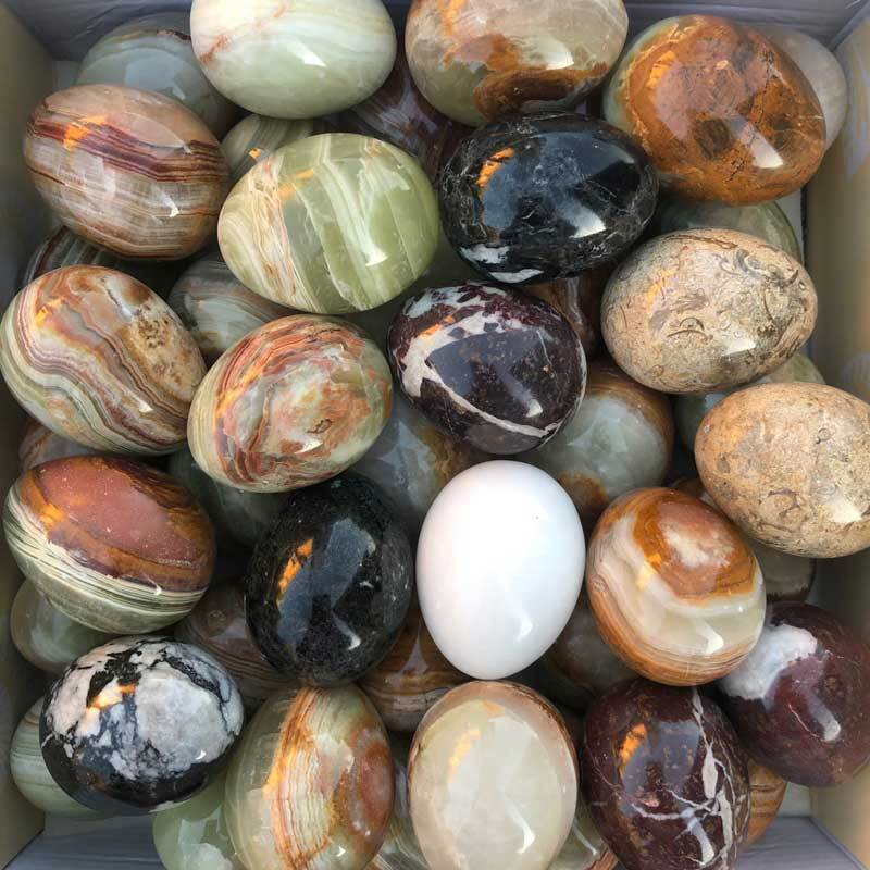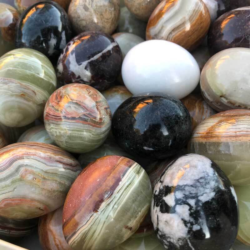 Very popular 2-inch tall polished mixed marble eggs for collectors, display and interest. Price is for one egg (images to show variation in eggs available).