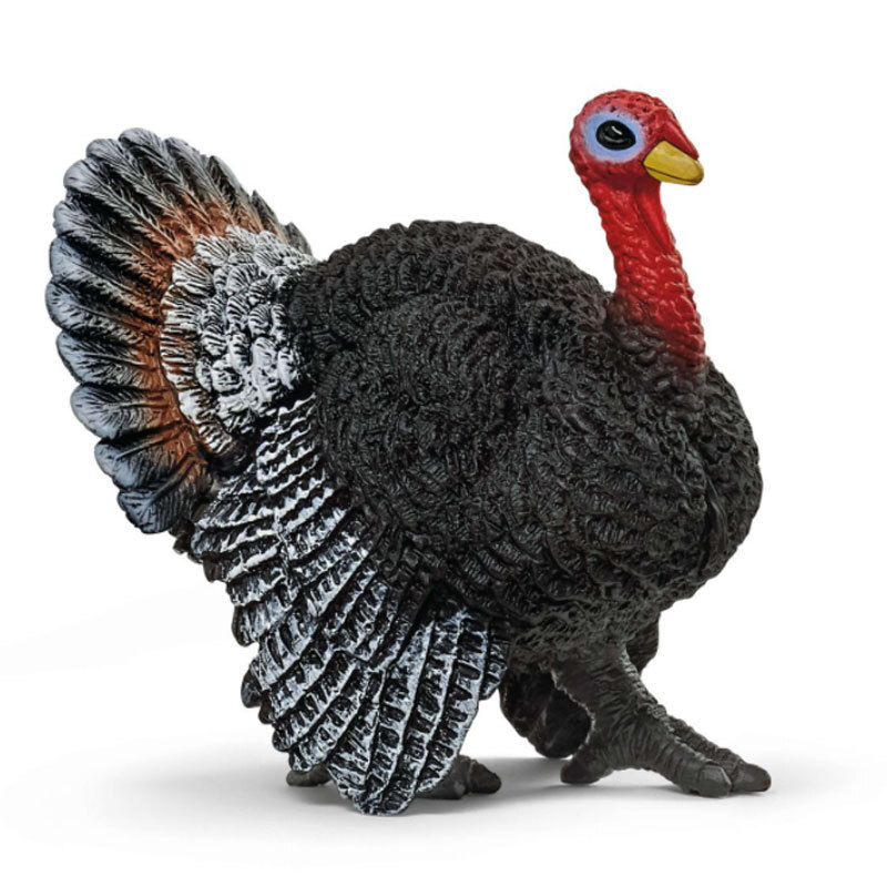 Turkeys are part of the pheasant family and are originally from North America. The male birds have thick plumage with individual metallic shimmering colourful feathers. The head and neck are featherless and coloured bright red and light blue. When male turkeys compete for females during mating season they spread their tail feathers out like a fan.