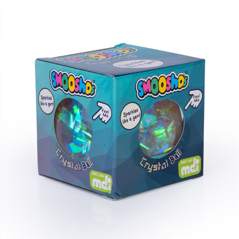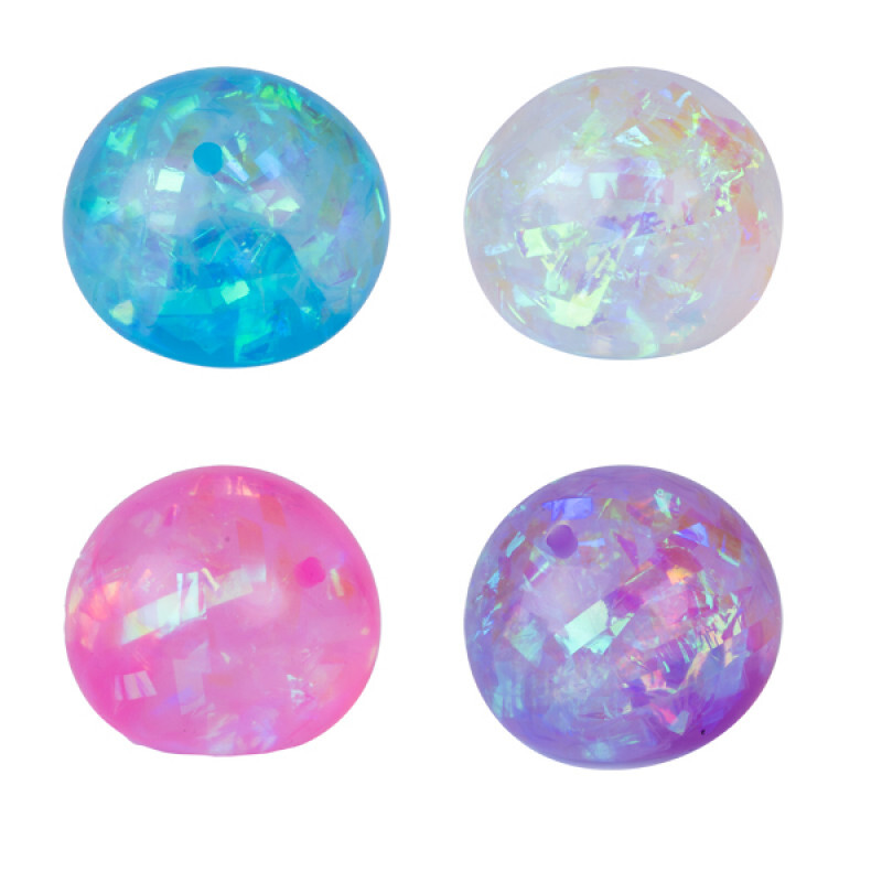 Squishy Smoosho ball with shiny iridescent ribbons inside that look like crystals. Fits perfectly in the palm of your hand