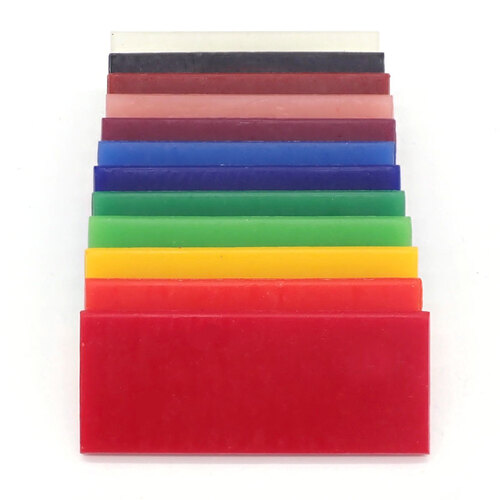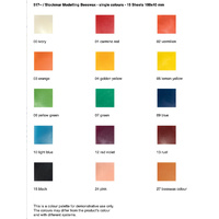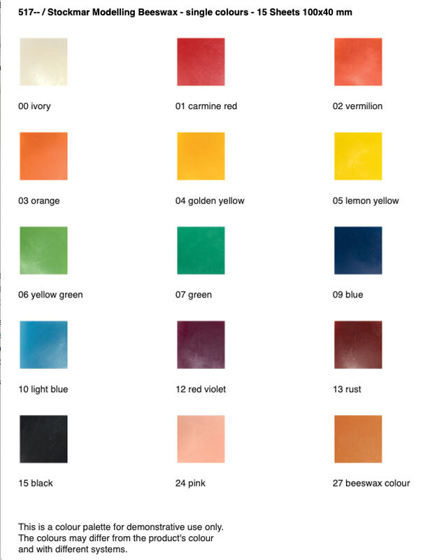 - Colours include Ivory, carmine red, vermillion, orange, lemon, golden yellow, yellow-green, green, blue, light blue, ultramarine, red violet, rust, black and beeswax colour